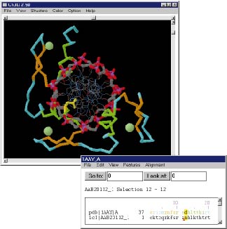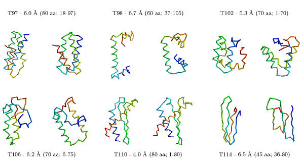 Ein alternativer Ansatz besteht darin, ausgehend von vorhandenen Protein-Folds zu versuchen, eine Sequenz in alle möglichen Folds "einzupassen". Diese Methode wird als Threading bezeichnet. Sie bezieht ihre Berechtigung aus der Tatsache, dass im Laufe der Evolution nur eine begrenzte Anzahl prinzipieller Protein-Folds entstanden ist (ca. 1000) und somit mit zunehmender Anzahl gelöster Strukturen die Erfolgschance dieses Ansatzes weiter steigt, da sämtliche Protein-Folds bzw -Superfamilien (ca. 15000) eines Tages in der Strukturdatenbank repräsentiert sein werden. Beispiel (klein, groß). |
